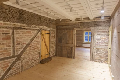 Koka māja Vecpilsētas ielā 14 ir valsts nozīmes arhitektūras piemineklis un viena no senākajām un vērtīgākajām koka dzīvojamām mājām Jelgavā, kas saglabājusies līdz mūsdienām. 2018.gadā uzsākot būvdarbus, koka māja bija avārijas stāvoklī, tā nebalstījās uz monolītiem pamatiem, bet turējās uz laukakmeņiem un ķieģeļu mūra fragmentiem. Tāpēc ēku pacēla, izbūvēja jaunus pamatus, atsēdināja māju atpakaļ un restaurēja vēsturiskās ēkas būvapjoma oriģinālās koka konstrukcijas. Tas bija sarežģīts un unikāls process Latvijas mērogā, un video sižetu par to mājas apmeklētāji var noskatīties jaunajā ekspozīcijā.