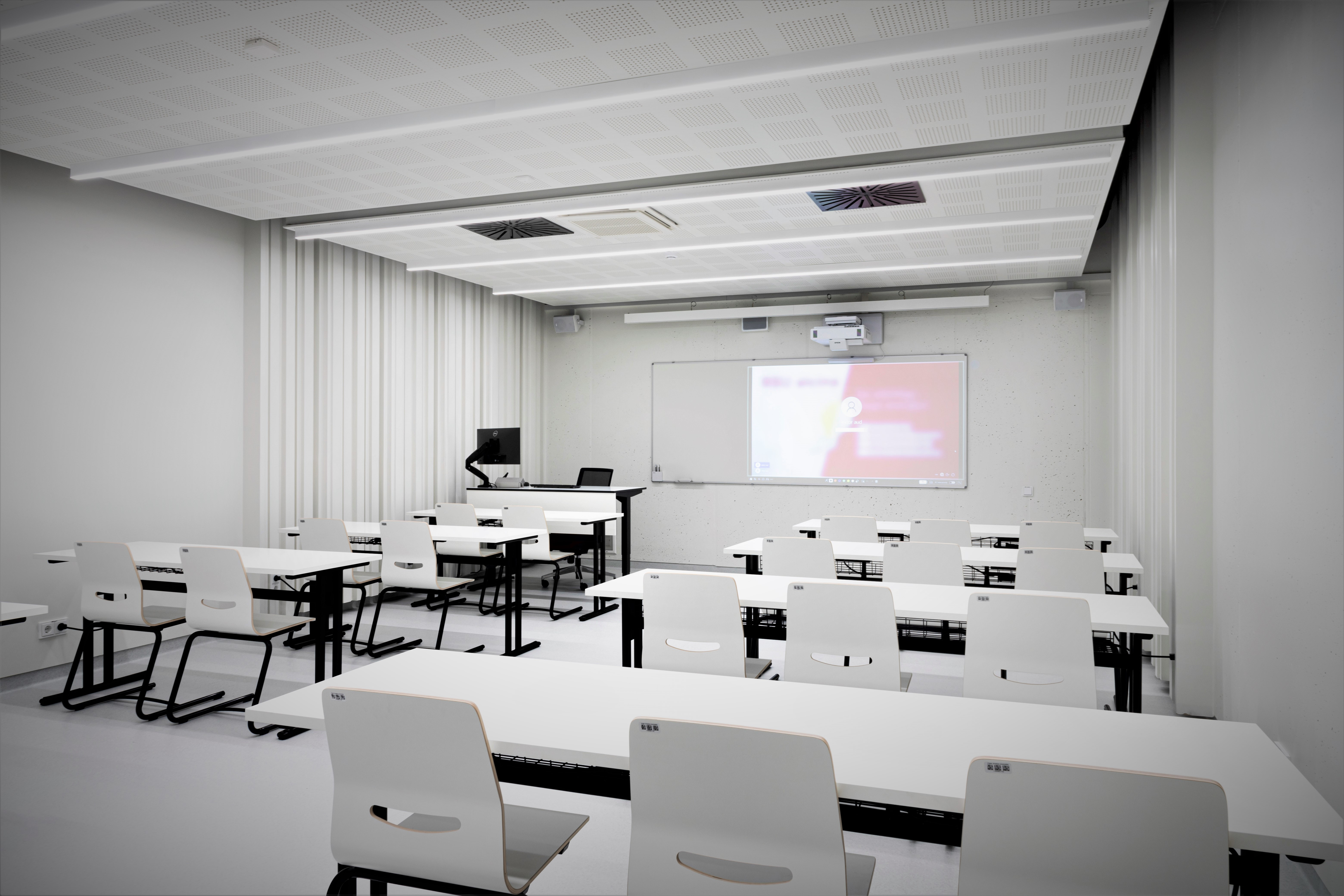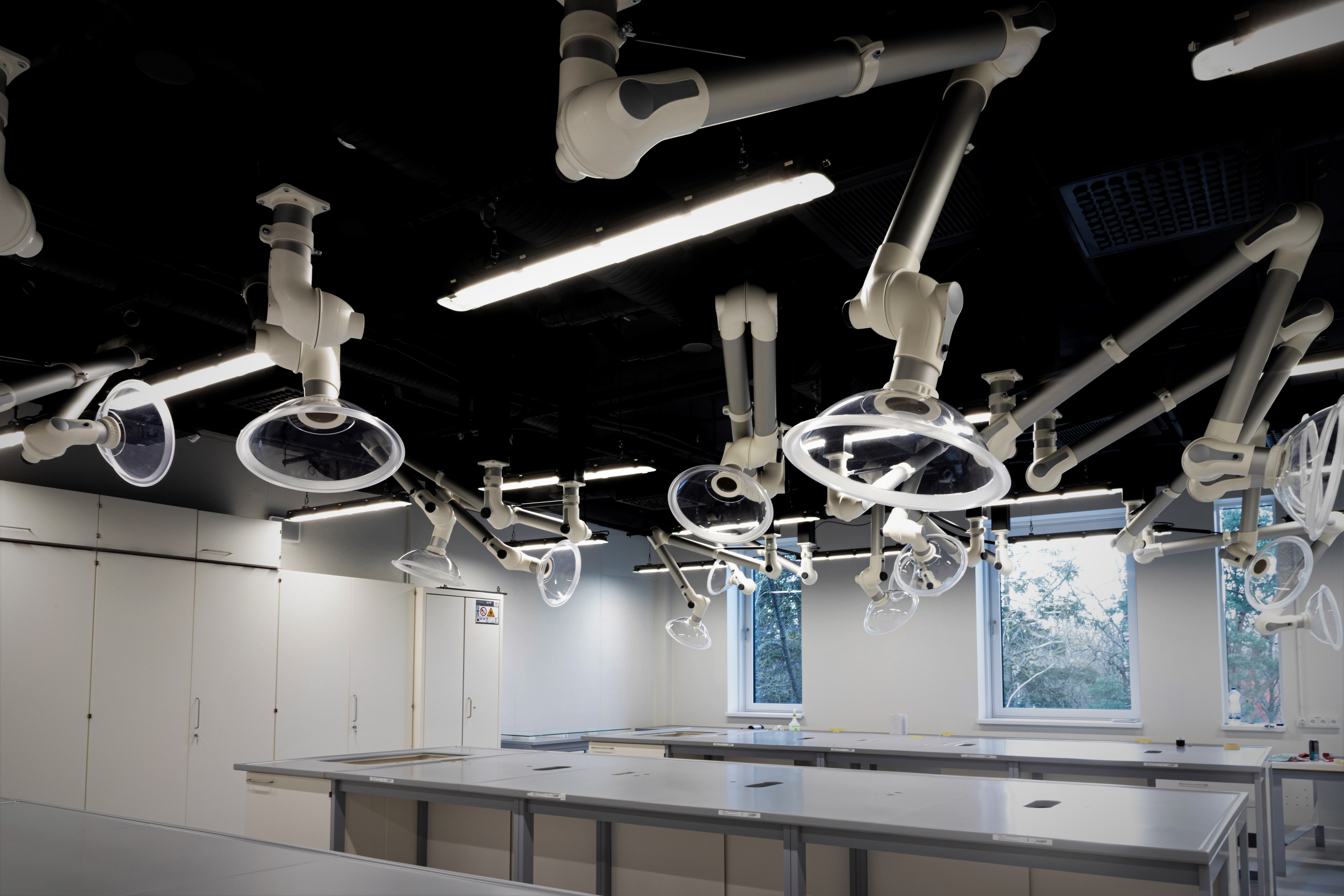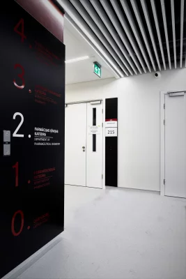 Ēkā izveidotas kopumā četras auditorijas, 11 mācību telpas, 10 studiju laboratorijas un septiņas laboratorijas. Gatavo zāļu formu laboratorija veidota, ievērojot rūpnieciskās farmācijas nozares principus, tostarp veidojot tīrtelpas, kas atbilst ISO 8 standartam.