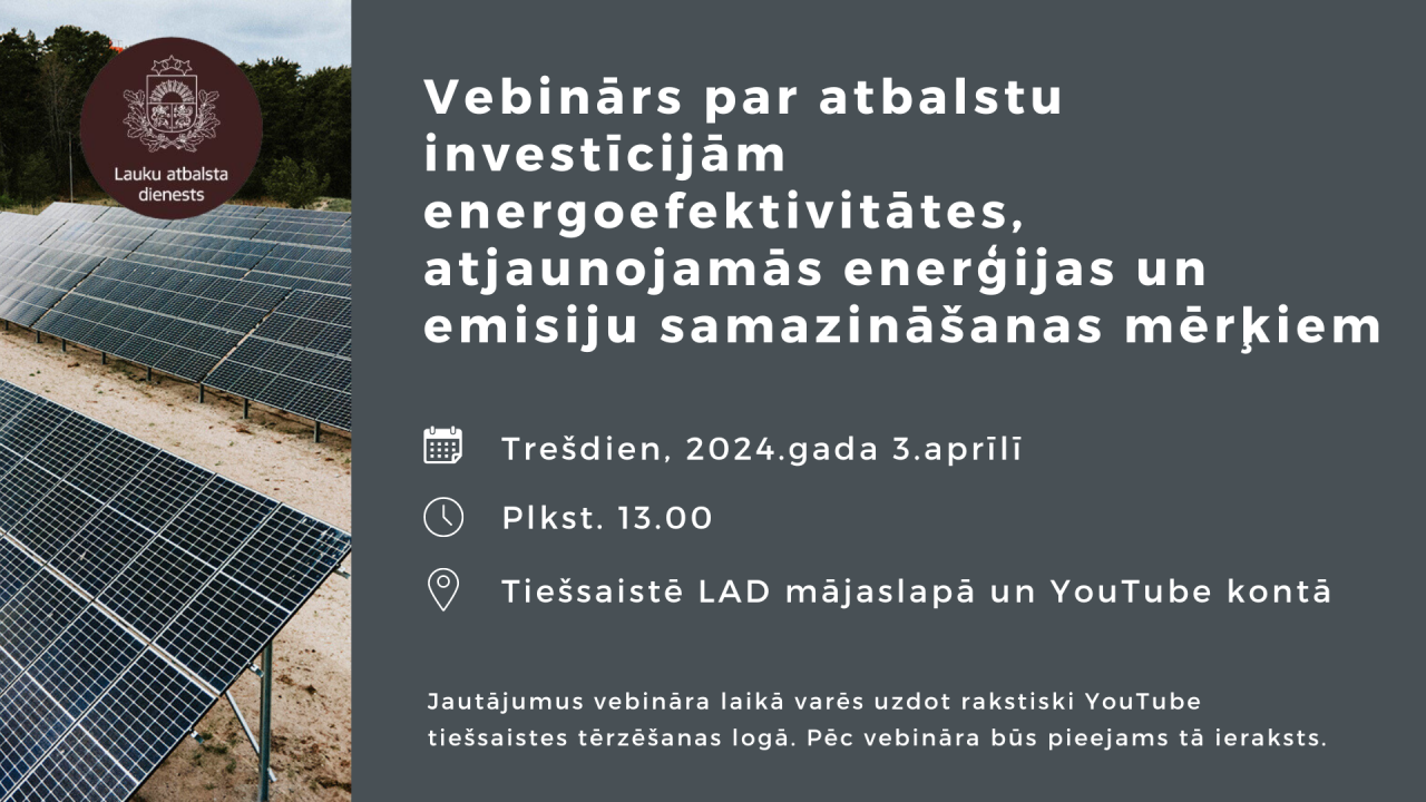 Vebinārs par gaidāmo atbalsta pasākuma kārtu tiek organizēts tiešsaistē, tajā var piedalīties, noskatoties to LAD mājaslapā un YouTube kontā. Jautājumus vebināra laikā varēs uzdot rakstiski YouTube tiešsaistes tērzēšanas logā. Pēc vebināra būs pieejams tā ieraksts. Vebināram pieteikties iepriekš nav nepieciešams. Pirms pasākuma jautājumus var sūtīt uz e-pastu prese@lad.gov.lv.