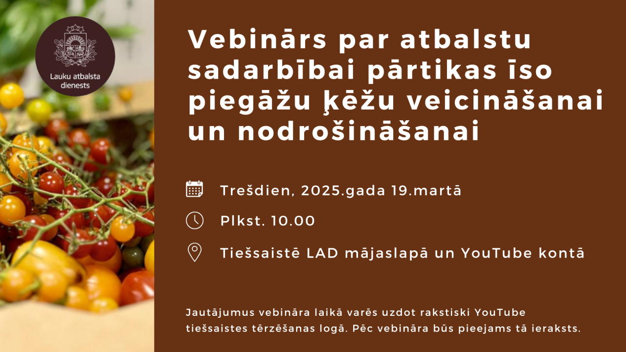2025. gada 19.martā plkst.10.00 notiks Lauku atbalsta dienesta organizēts vebinārs par nosacījumiem atbalsta saņemšanai pasākumā “Sadarbība pārtikas īso piegāžu ķēžu darbības veicināšanai un piedāvājuma nodrošināšanai”.