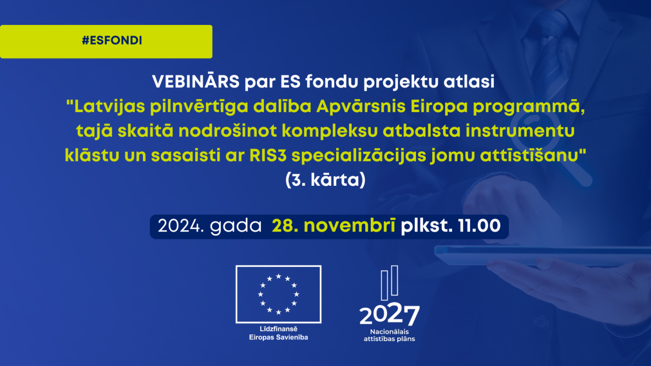 Vebinārs par ES fondu projektu atlasi "Latvijas pilnvērtīga dalība Apvārsnis Eiropa programmā, tajā skaitā nodrošinot kompleksu atbalsta instrumentu klāstu un sasaisti ar RIS3 specializācijas jomu attīstīšanu" (3. kārta)