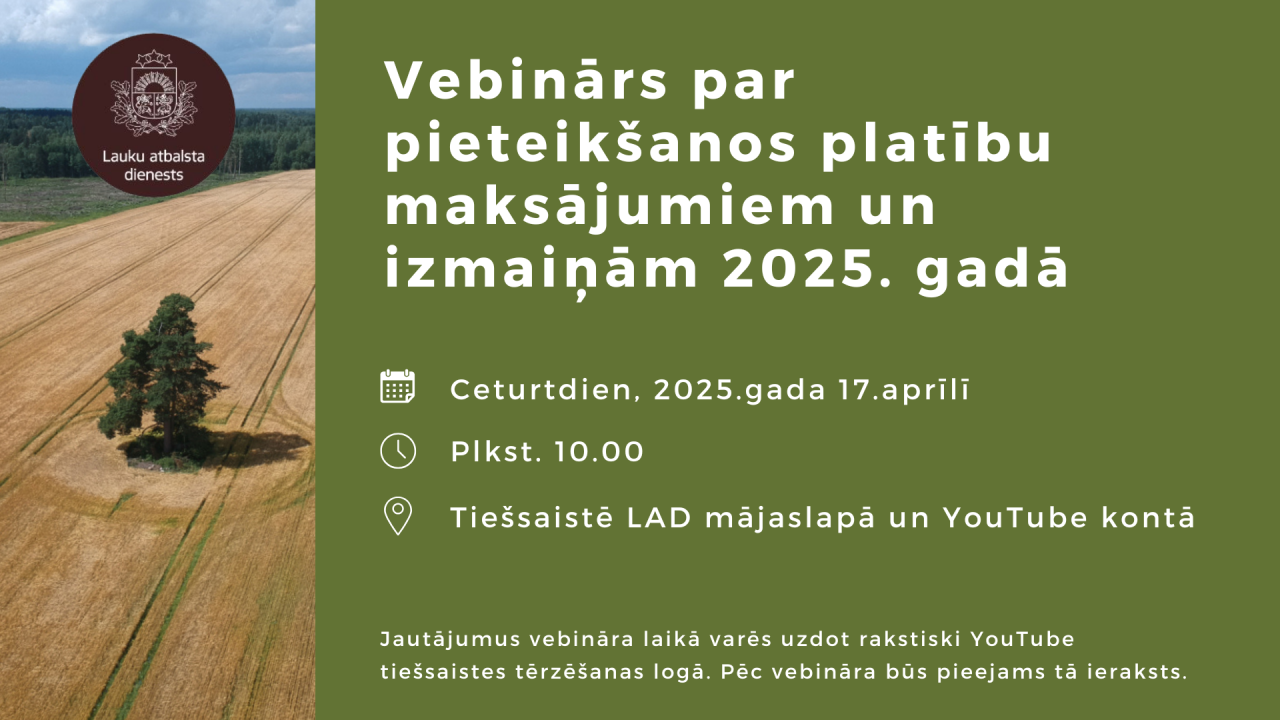 17.aprīlī plkst. 10.00 lauksaimnieki ir aicināti piedalīties vebinārā, kura laikā Lauku atbalsta dienesta speciālisti pastāstīs par pieteikšanos platību maksājumiem, nosacījumiem to saņemšanai, kā arī gaidāmajām izmaiņām 2025. gadā.