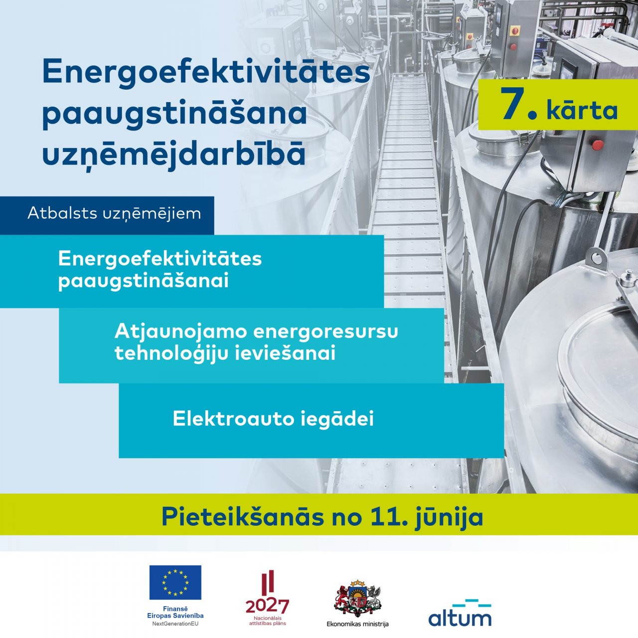 Attīstības finanšu institūcija ALTUM šā gada 11.jūnijā sāks pieņemt pieteikumus projektu atlases nākamajā, 7.kārtā, Eiropas Savienības Atveseļošanas fonda programmā energoefektivitātei, atjaunojamo energoresursu tehnoloģiju ieviešanai un elektroauto iegādei.
