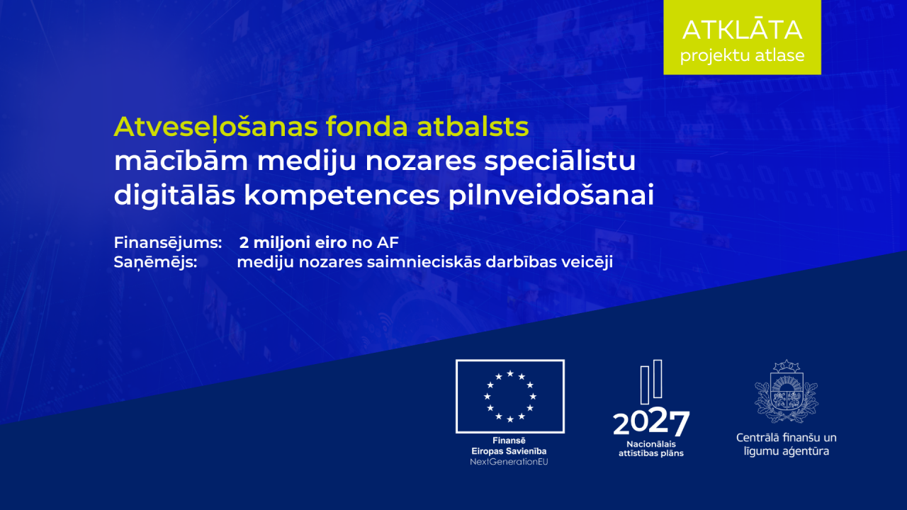 Centrālā finanšu un līgumu aģentūra (CFLA) ir izsludinājusi atklātu  projektu atlasi par Atveseļošanas fonda (AF) atbalstu mācību organizēšanai mediju nozares speciālistiem digitālās kompetences un zināšanu pilnveidošanai. Šim mērķim paredzēti divi miljoni eiro.
