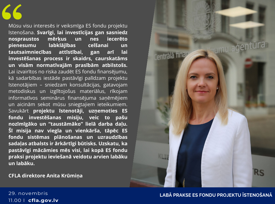 Trešdien, 29. novembrī, notiks tiešsaistes seminārs  “Labā prakse ES fondu projektu īstenošanā”, kur Centrālās finanšu un līgumu aģentūras (CFLA) pulcētie eksperti informēs par aktualitātēm Eiropas Savienības (ES) fondu jomā un sniegs ieteikumus projektu īstenošanai.