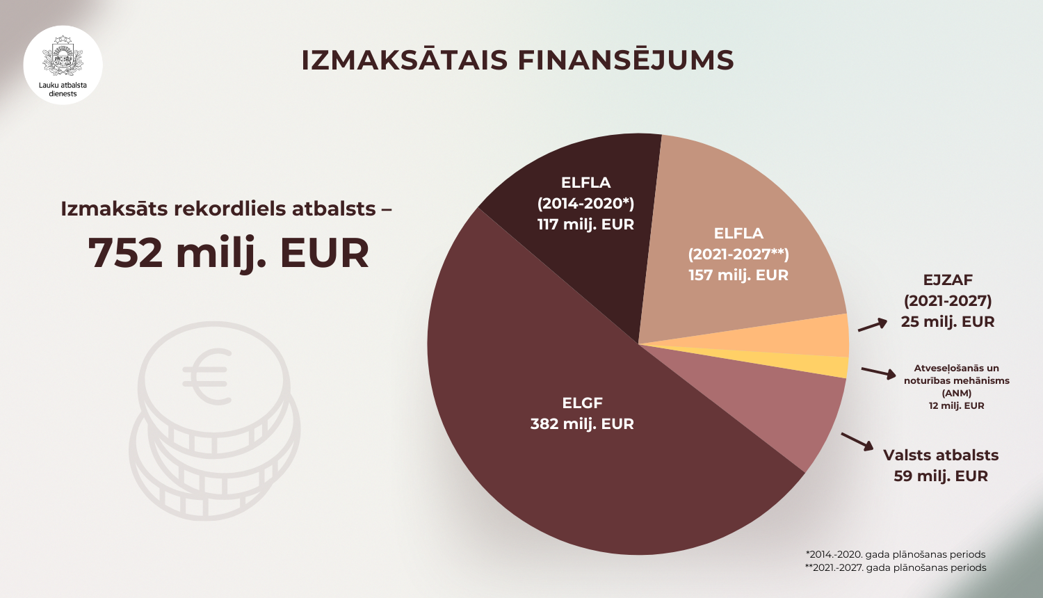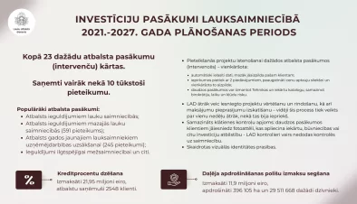 2025.gadā Lauku atbalsta dienests (LAD) ir veiksmīgi turpinājis veikt savus uzdevumus, kā arī ieviesis jaunus risinājumus, lai pēc iespējas labāk sniegtu atbalstu lauksaimniekiem, mežsaimniekiem, zivsaimniekiem un lauku uzņēmējiem. 2025. gadā LAD ir izmaksājis rekordlielu atbalsta summu – vairāk nekā 750 miljonus eiro. Tas tika darīts, lai LAD klienti saņemti pēc iespējas lielākus finanšu līdzekļus un varētu sekmīgi saimniekot turpmāk, ņemot vērā, ka gads bijis sarežģīts, piemēram, laikapstākļu nodarīto postījumu dēļ. Veiksmīgi ir noslēgts arī ELFLA 2014.–2020. gada plānošanas periods, izmaksājot finansējumu dažādos investīciju pasākumos.