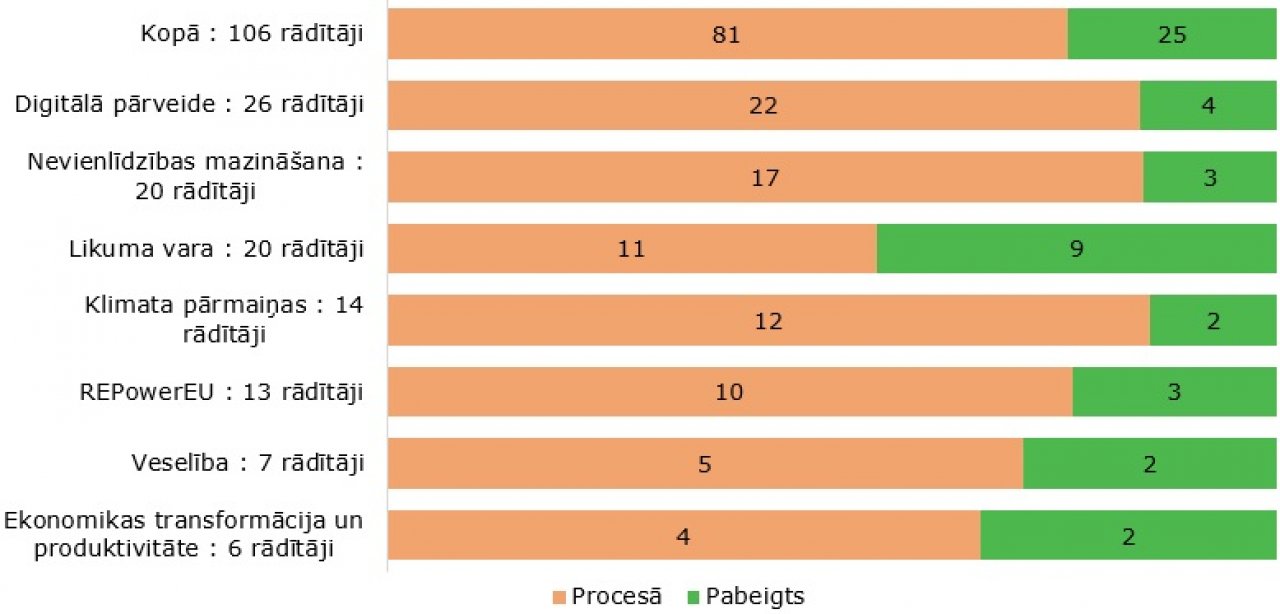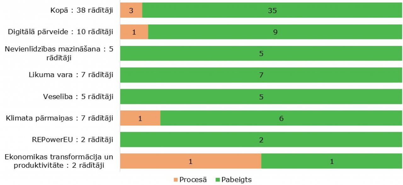 Piektā un sestā maksājumu pieprasījuma atskaites punktu/ mērķu izpilde pret Atveseļošanas fonda plānā noteikto izpildes termiņu dalījumā pa jomām (uz 2025.gada 05. novembri)